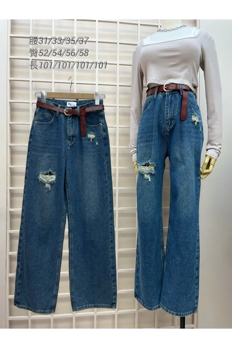 紅腰帶破損牛仔寬褲-8818AA