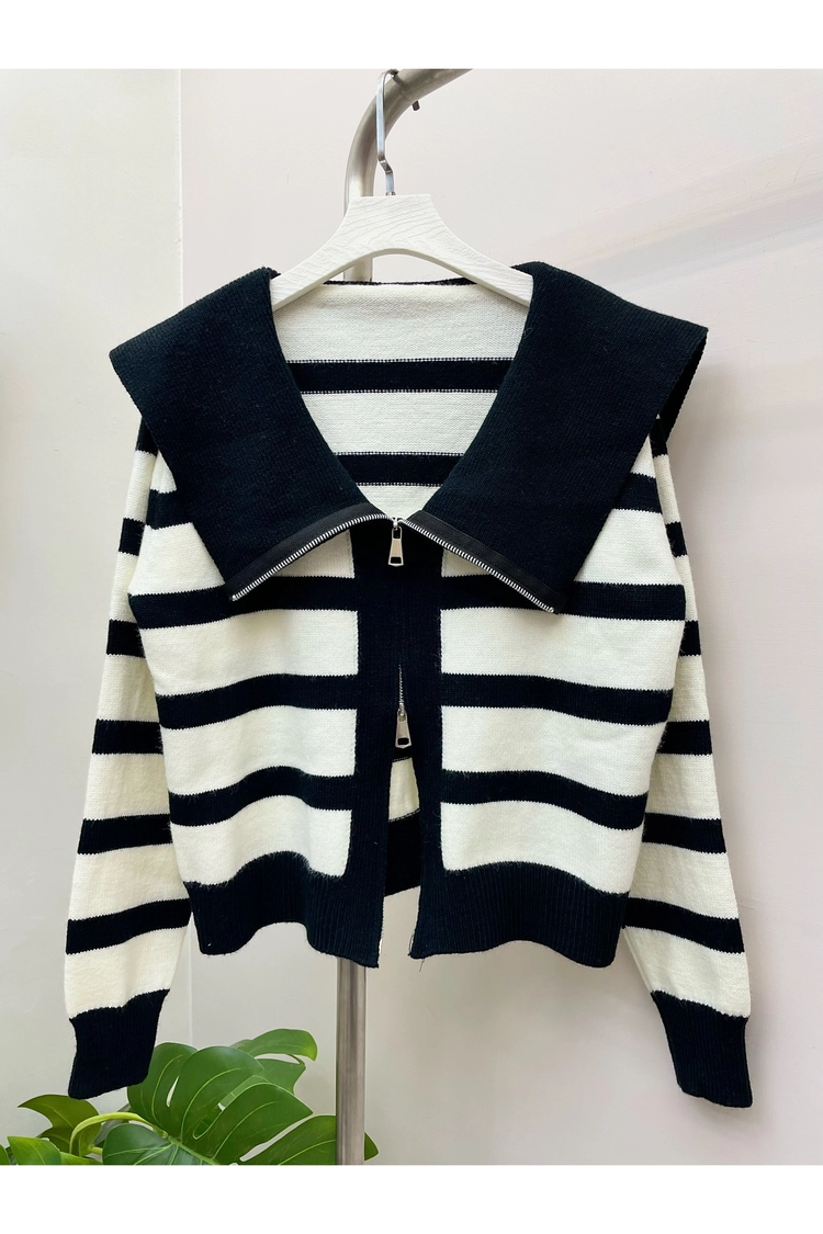 條紋大翻領上下拉針織衣-1019K