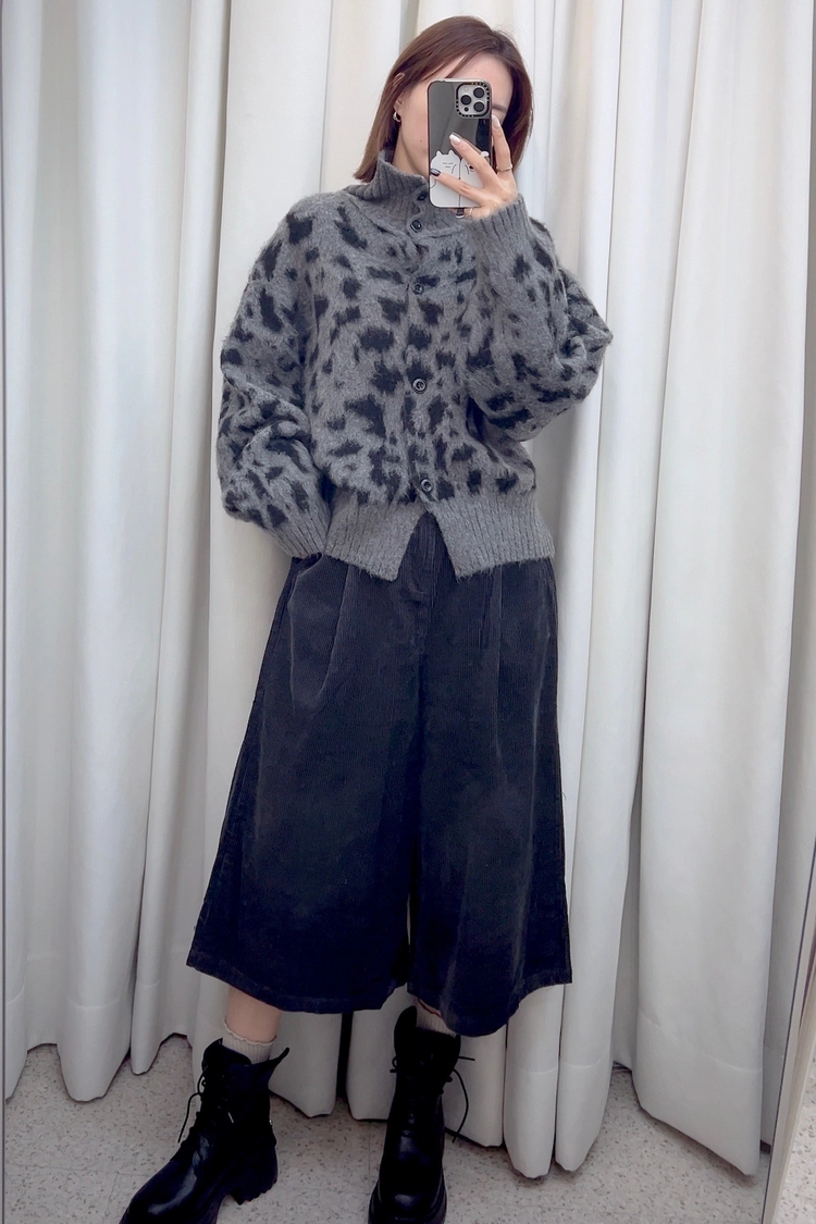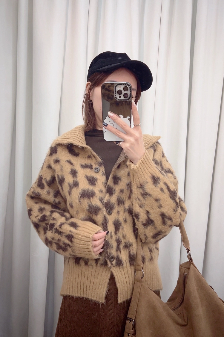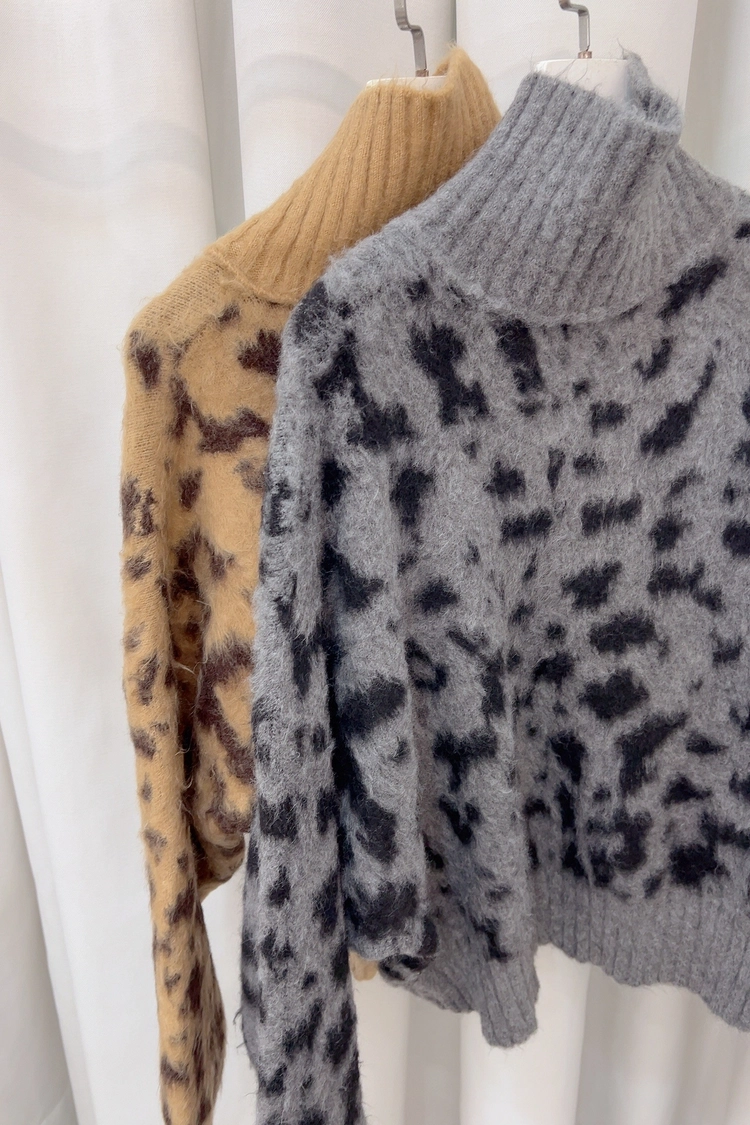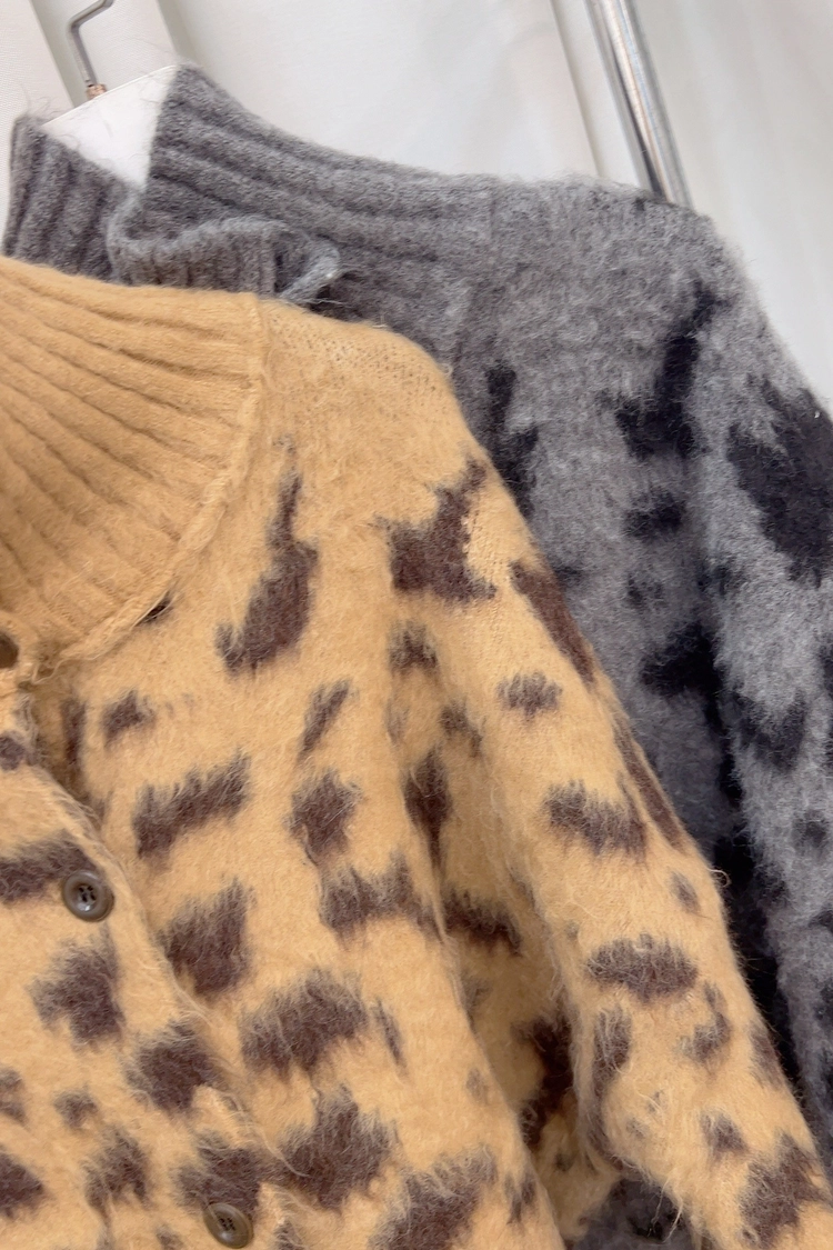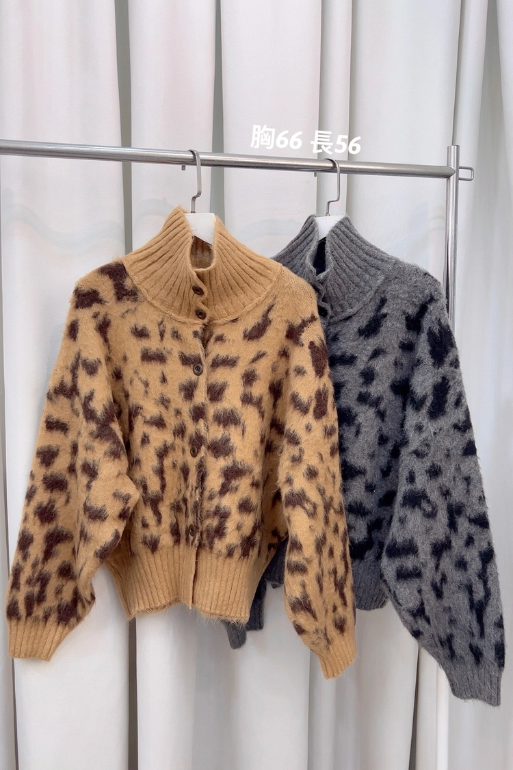 豹紋排釦立領毛感毛衣